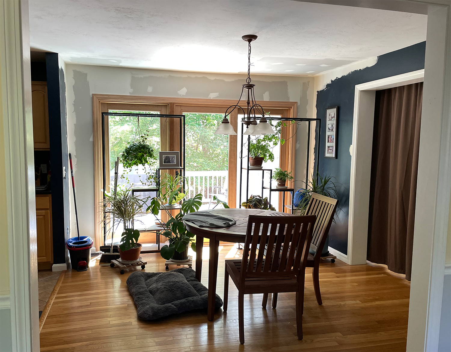 The back of the houseThe plan was to open up the back to the largest door which would fit in the wall to bring my woods into focus instead of the large wooden divide where the french doors met. Besides it had taken me a year to seal up the warped doors without shrink wrap. The front of the houseIn front, the plan was to allow as much light as possible due to the dark nature of the space I constantly traversed between my kitchen, living room, and office Door interior presentationsI thought very clearly about coloring of these doors because if one stands in the dining room, both doors are in sight as I will show you later. This is because the front